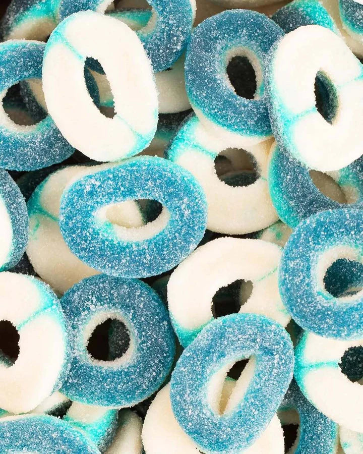 Des bonbons gélifiés en forme d’anneaux à la framboise, recouverts de sucre acidulé, pour un goût à la fois sucré et piquant qui ravira les amateurs de sensations gourmandes.