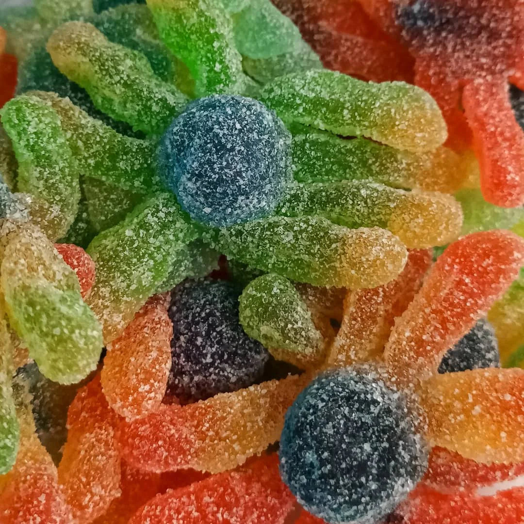 Des bonbons gélifiés en forme de petits poulpes colorés, au goût fruité et acidulé. Moelleux et recouverts d’un sucre qui pique, ils offrent une gourmandise ludique et pétillante, parfaite pour régaler les amateurs de sensations sucrées et acidulées.