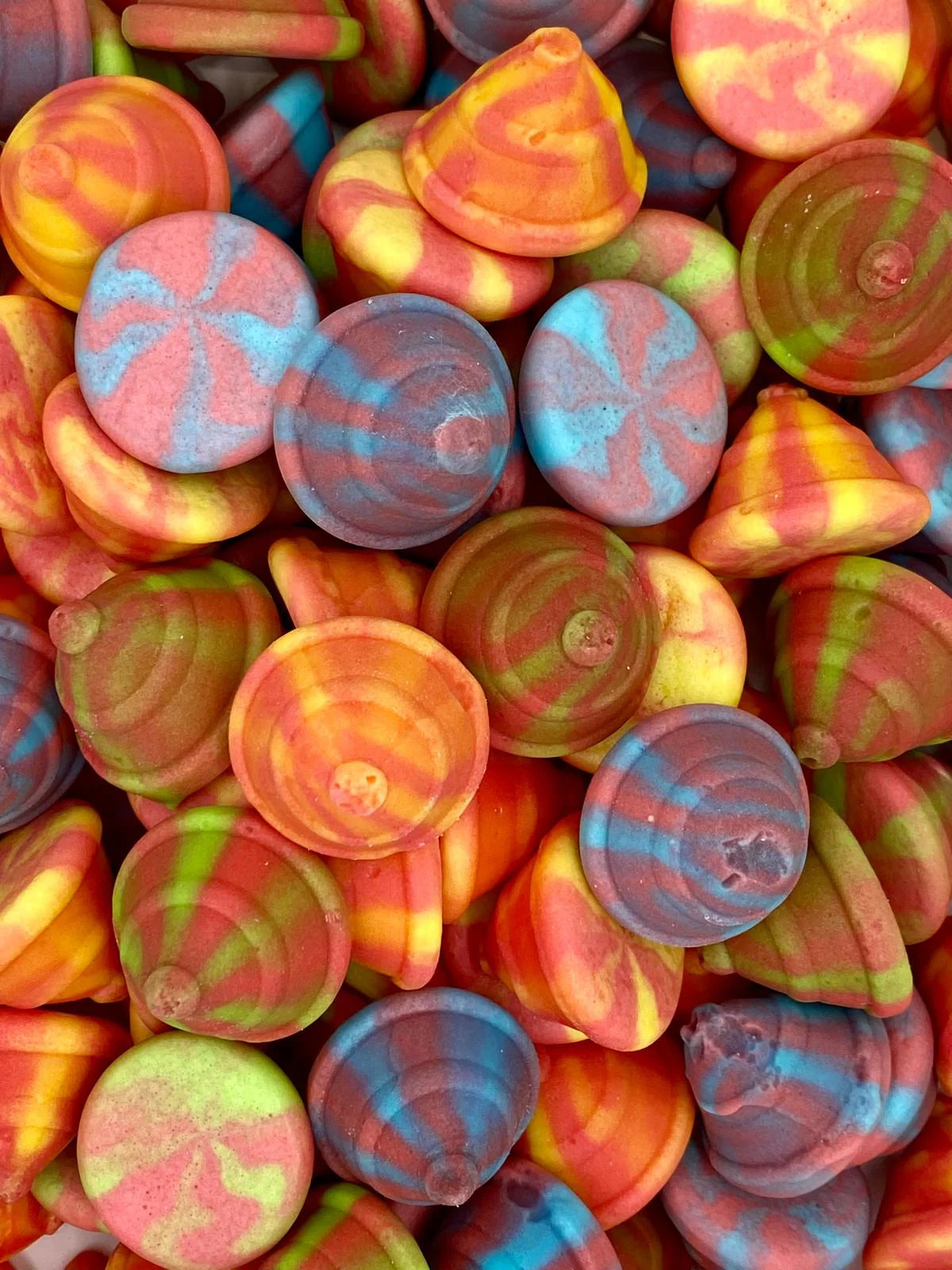 Des bonbons gélifiés en forme de toupie, aux saveurs fruitées variées, moelleux et colorés, pour un plaisir gourmand amusant à partager.